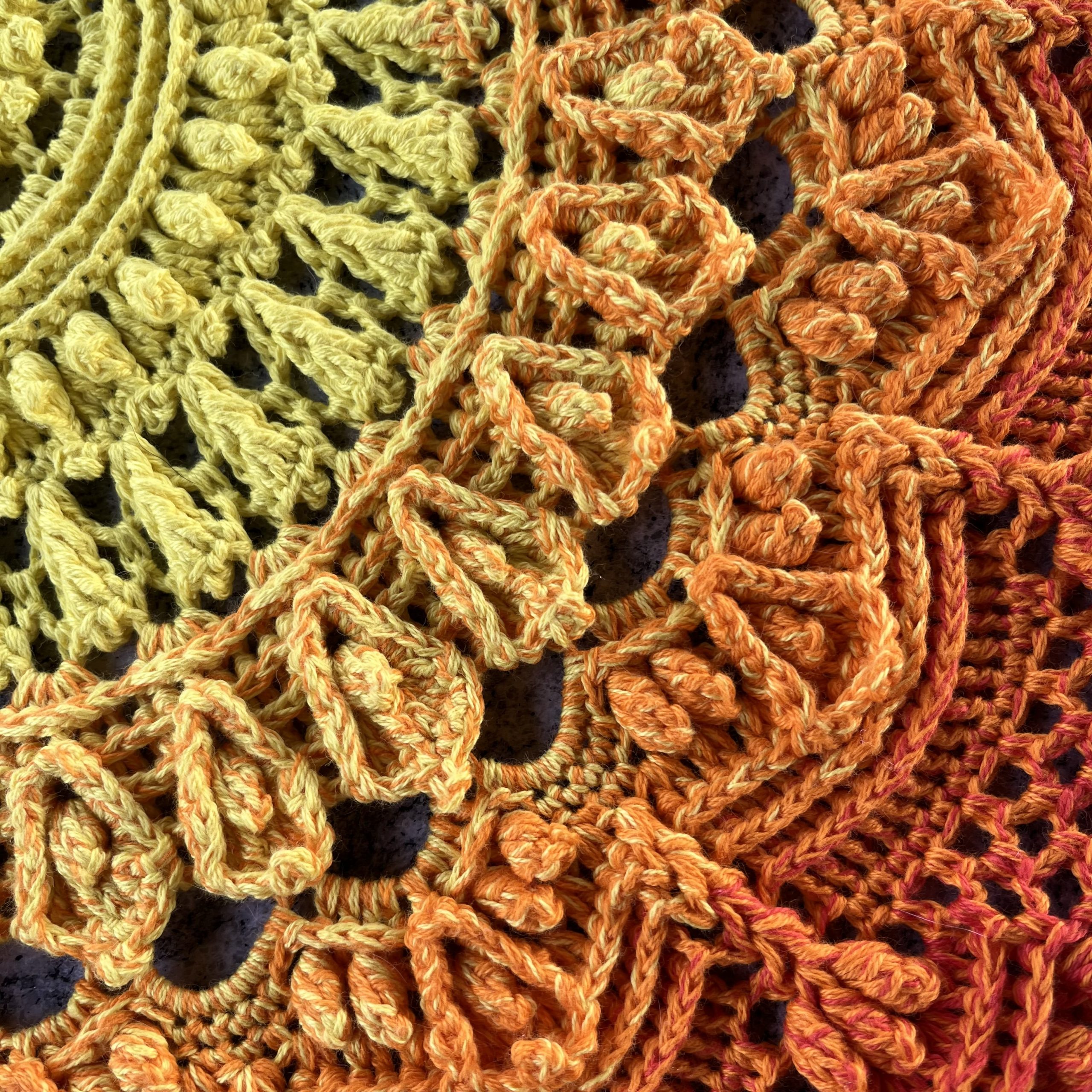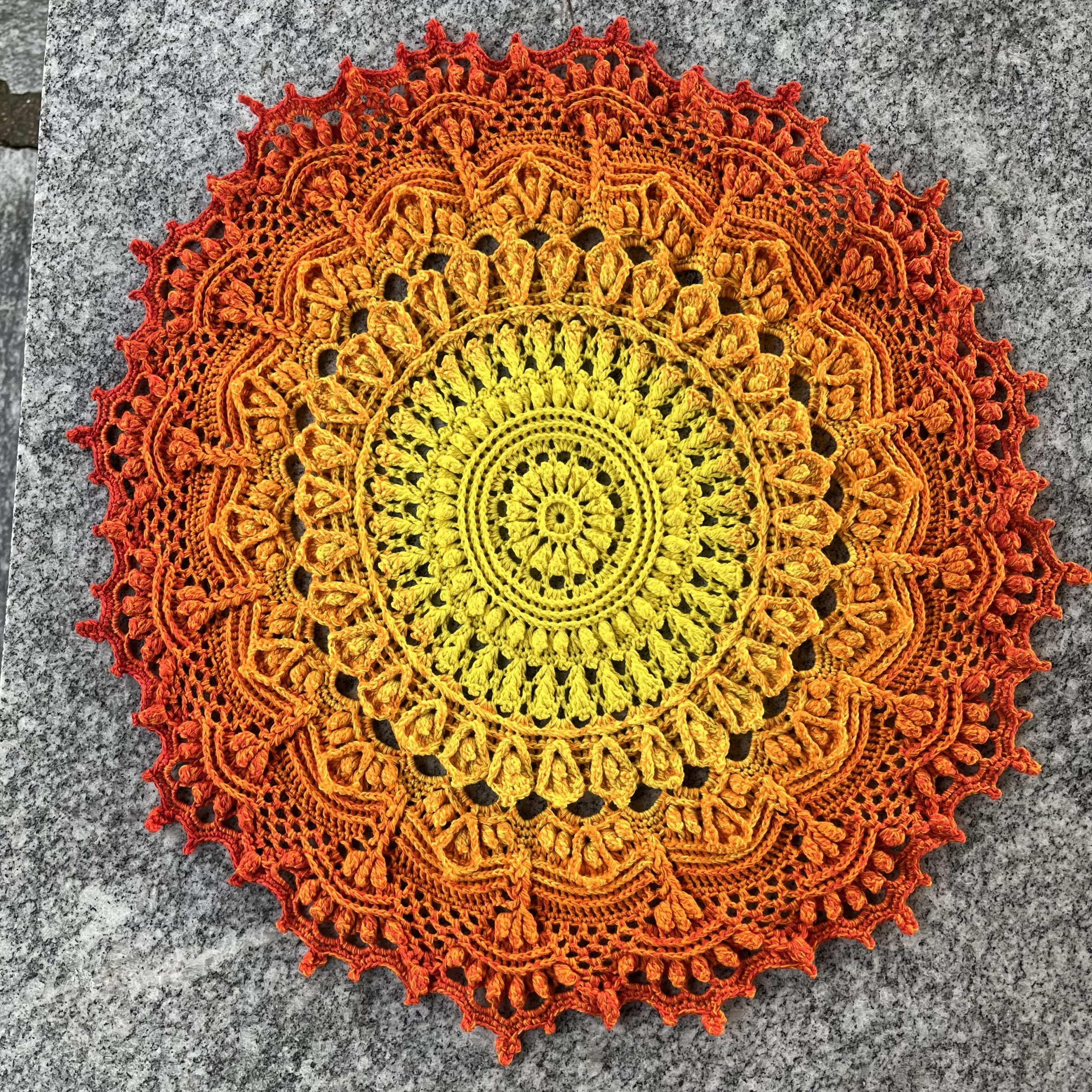 Heklet rund duk, i et opphøyet mønster, ca 48 cm i diameter. Fargene er som å ha sola på bordet